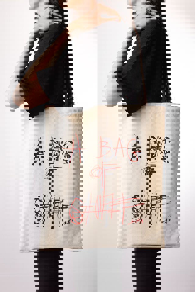 「A Bunch of Stuff」展にインスパイアされた「A Bag of Stuff」トートバッグは、耐久性のある天然素材、黒いストラップ、遊び心のあるプリントデザインが特徴です。毎日の必需品を運ぶのに最適な、アートと実用性をパーフェクトに融合したバッグです。