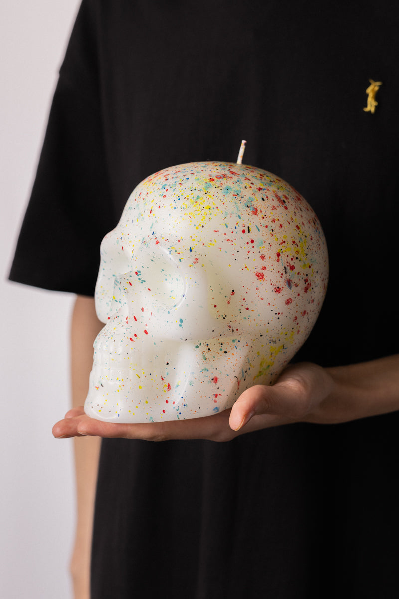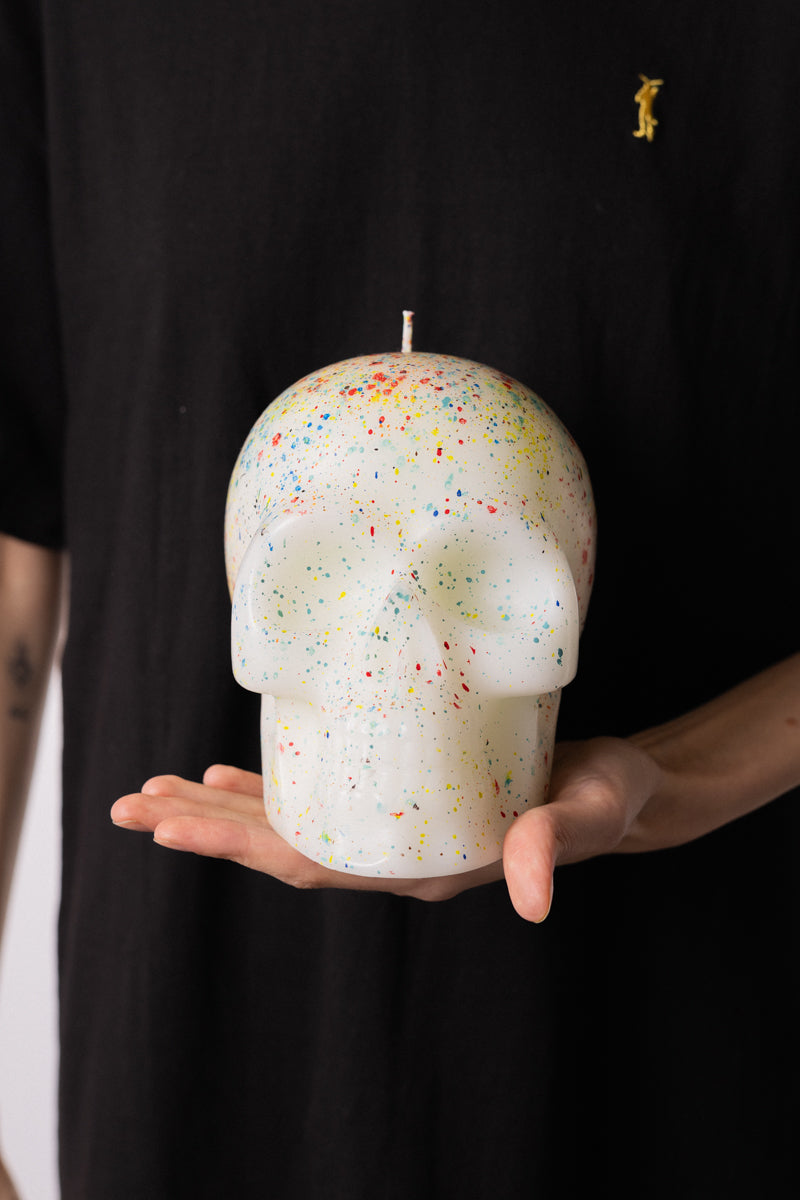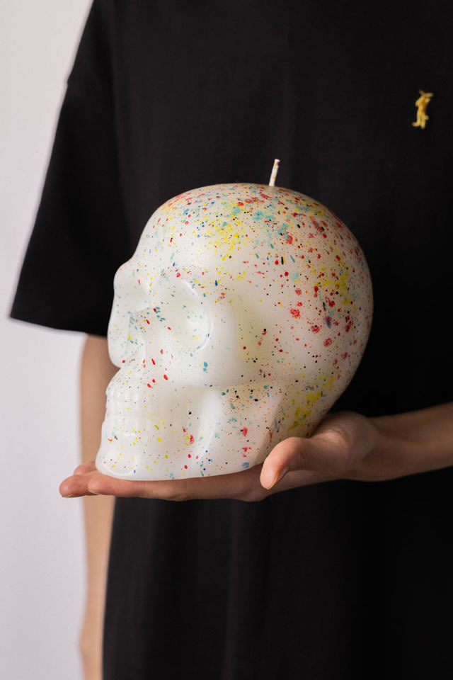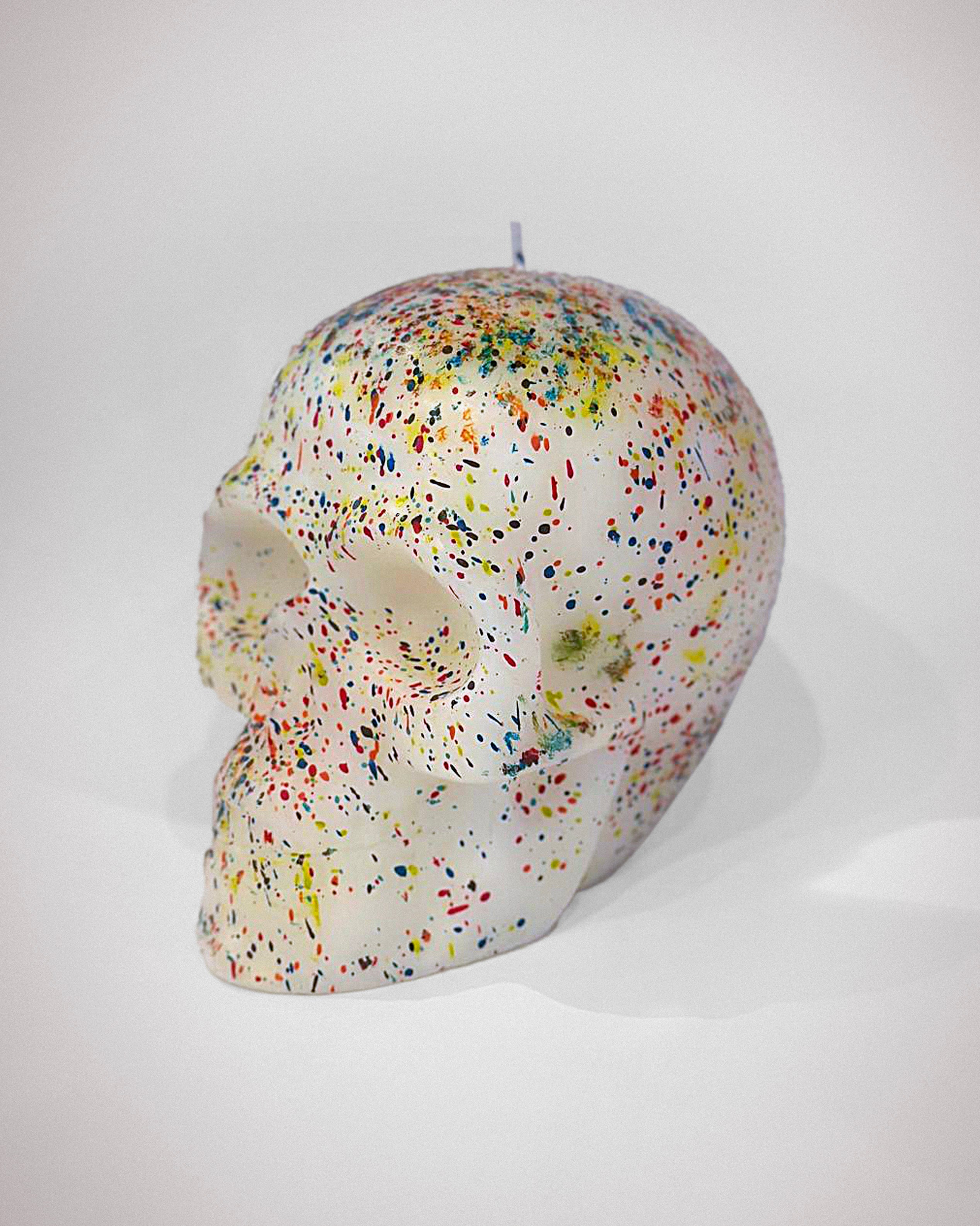 ジョニーの『Death By Confetti』絵画にインスパイアされたこのカラフルで不気味なキャンドルは、喜びとリラックスをもたらすようにデザインされています。