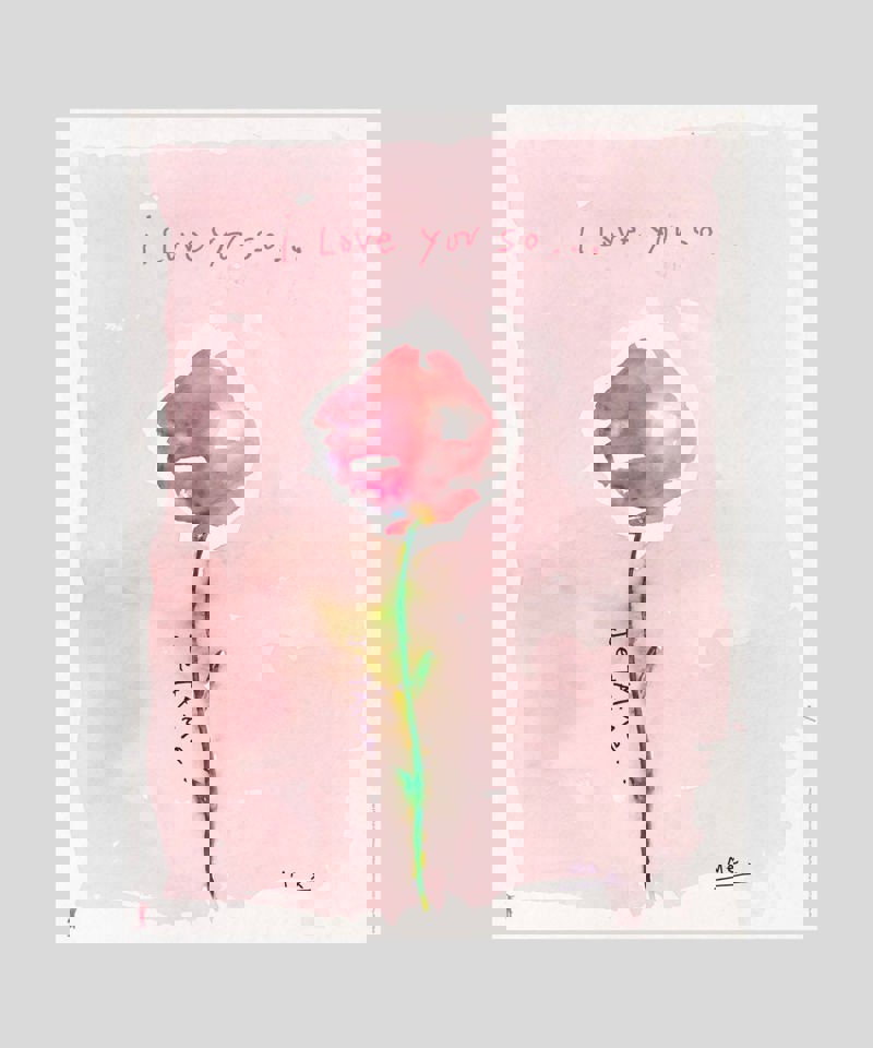 元々は水彩画で描かれたこのポスターは、咲き誇るバラが特徴です。花びらはファシア、ライラック、ダークブルー、ピーチの様々な色合いで形成されています。花は白い空間の枠で強調され、ベビーピンクの背景に溶け込む緑の茎に支えられています。