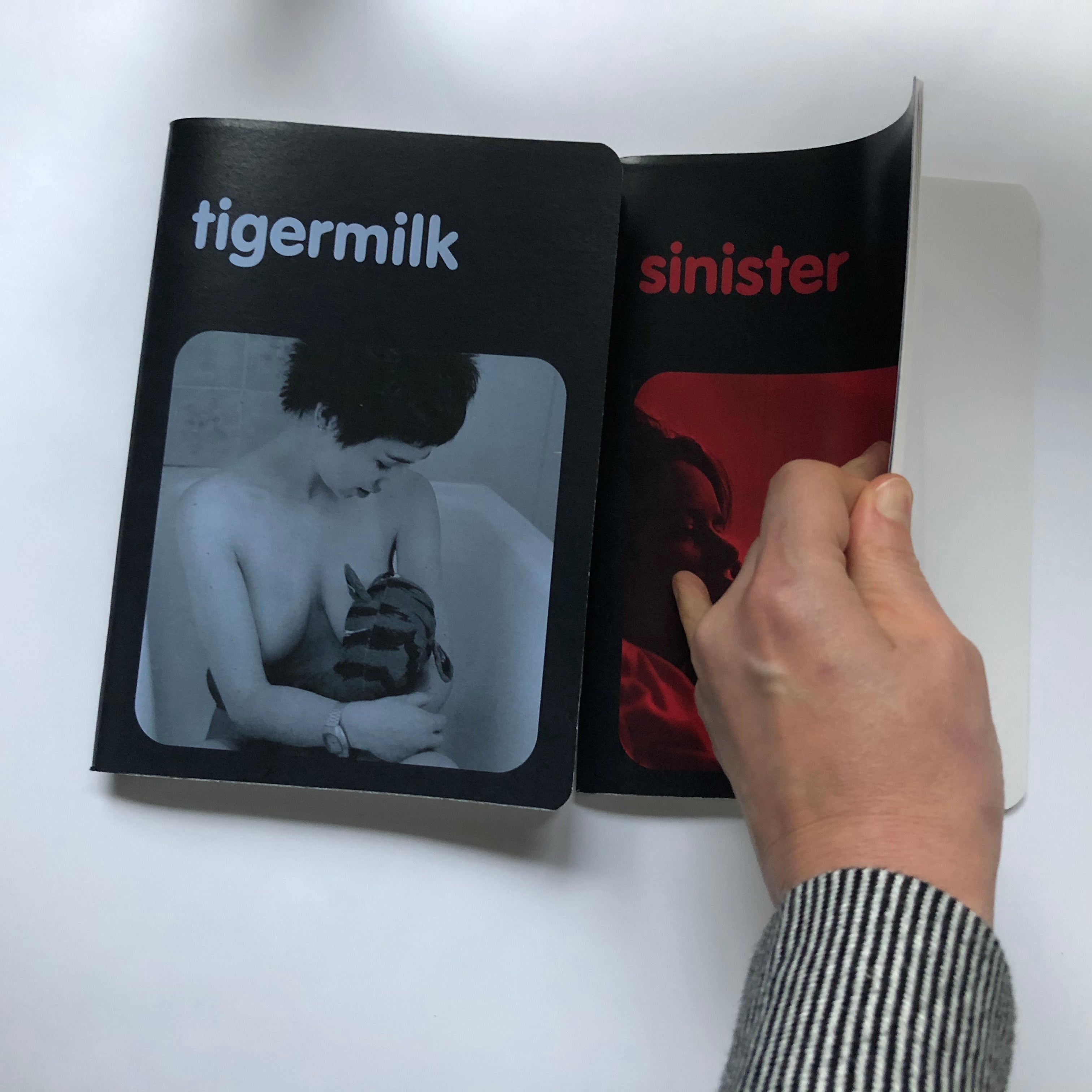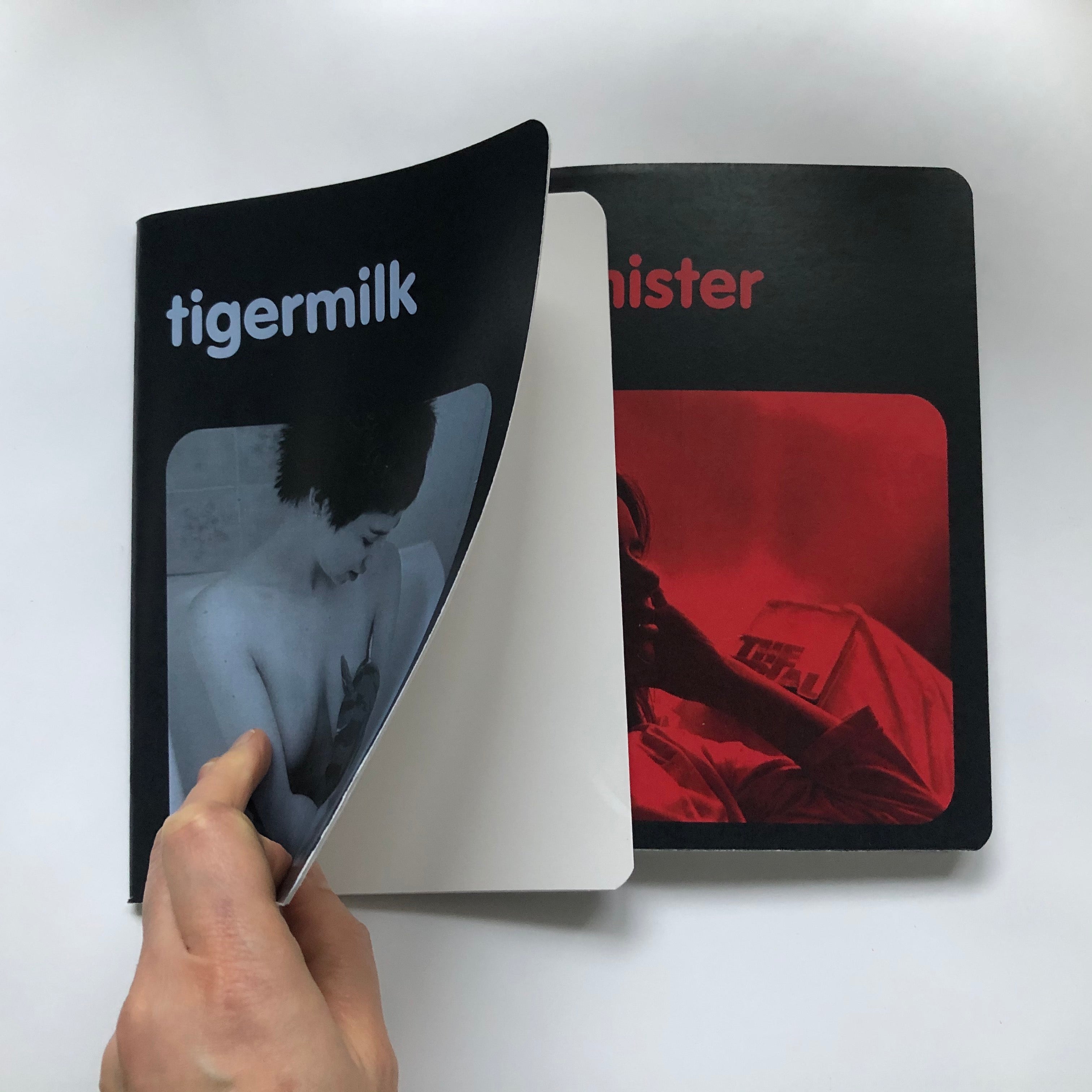 クラシックな「sinister」と「tigermilk」のアートワークが印刷された、A5 サイズのメモ帳 2冊セット。