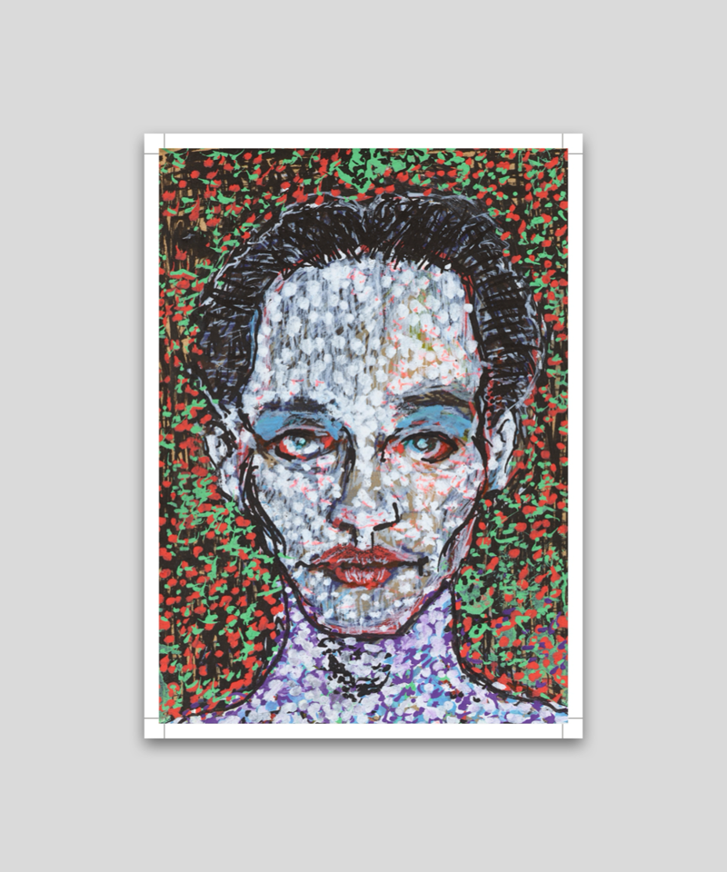 この肖像画は、紙吹雪のような点描と鋭角的なディテールが特徴です。ジョニー・デップの精密でありながら実験的な技法が光る作品です。2022年のジョニー・デップのアートワークを基にしています。